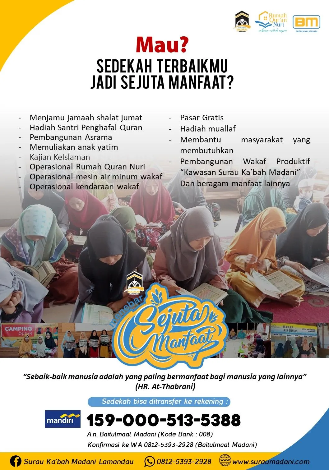Baitulmaal Madani hadir untuk menjadi mitra amal shalih Anda. Baik melalui Zakat, Infak, Sedekah, maupun Wakaf terbaik Anda. Alhamdulillah dengan dukungan Bapak Ibu orang baik, setiap bulannya ada ratusan orang bisa menikmati fasilitas kegiatan pendidikan al-Quran, kegiatan sosial hingga kegiatan dakwah / kajian di Musholla Madani.